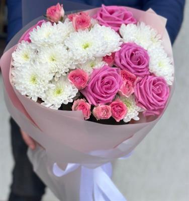 Composition: 5 pink roses Aqua, 3 white chrysanthemum Baltika, 1 pink peony-flowered shrub rose Mimi Eden