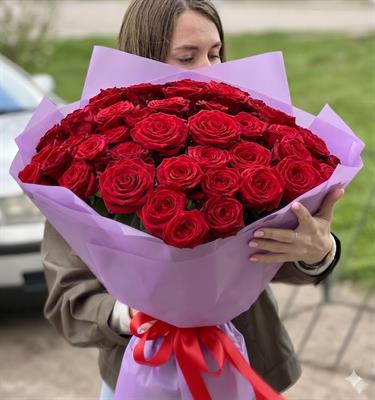 51 roses in a stylish design made of lilac tracing paper with a red ribbon is a bouquet that will say everything for you.