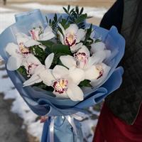 Decoration: pistachio, orchid extenders, white matte cellophane, white satin ribbon.