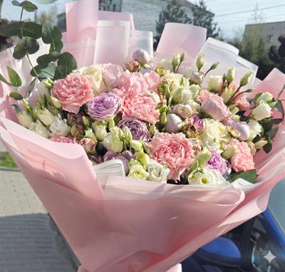 Composition: 2 pink and 1 white hydrangeas, 5 lavender roses Memory Lane, 5 pink carnations, 2 white peony roses White O'Hara, 4 stems of white and 4 stems of pink lisianthus