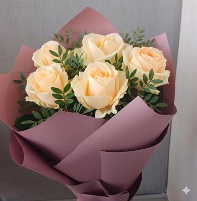 Composition: 5 cream roses Peach Avlanch or Talea.