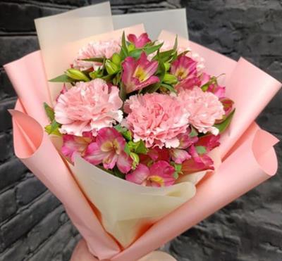Composition: 5 pink carnations (dianthus), 4 branches of pink alstroemeria
