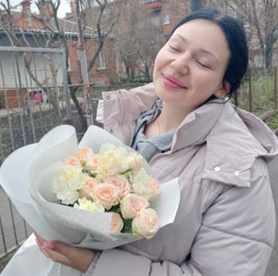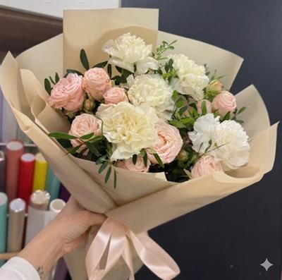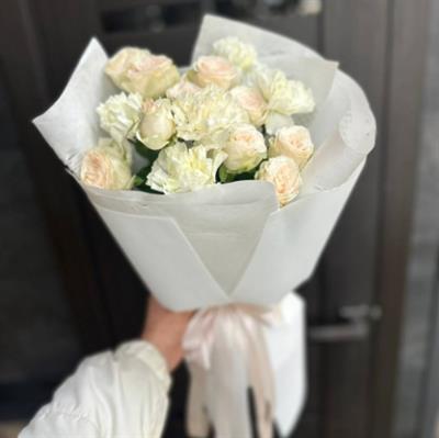 Composition: 5 white dianthus (carnations), 2 stems of cream spray rose Tanya