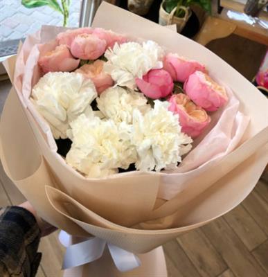 This bouquet of spray roses and dianthus feels like an early morning by the shore. Soft white and cream petals reflect the calm rhythm of the waves, the scent of salt, and the warmth of sunlight on the water.