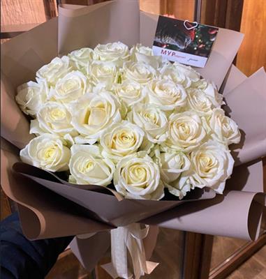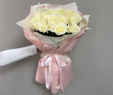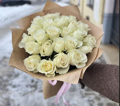 Букет «Ванильное небо» — воплощение нежности и элегантности, состоящий из 25 белоснежных роз. Для этой композиции мы используем премиальные сорта Аваланч или Атена . Эти розы знамениты своими крупными, бархатистыми бутонами, которые раскрываются в пышные облака, и тонким, едва уловимым ароматом.