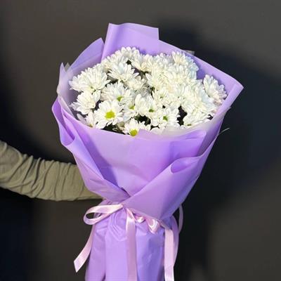 Букет из семи веток ромашковой хризантемы сорта Бакарди, оформленный фиолетовым флизелином и фиолетовой атласной лентой это прекрасный выбор для людей, которые хотят подарить нежность и элегантность. Это композиция особенно привлекательна. Такой букет станет прекрасным подарком на День учителя, 1 сентября, День матери, день рождения или другие важные события.