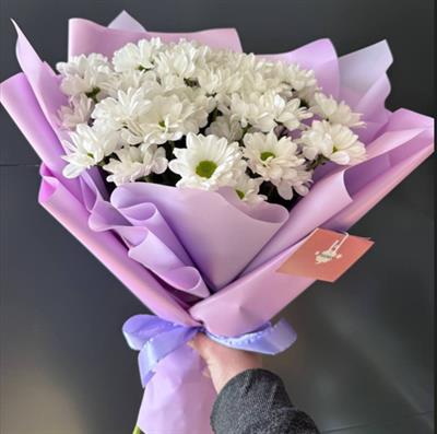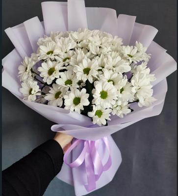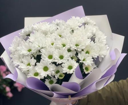 Белоснежные ромашковые хризантемы в стильном фиолетовой кальке выглядят особенно ярко и контрастно. Такая композиция станет прекрасным знаком внимания для мамы, свекрови, коллеги или близкой подруги.