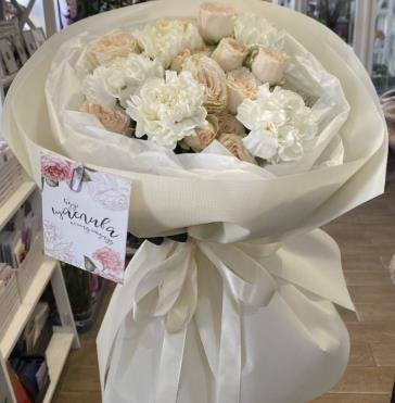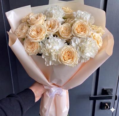 Состав: 5 белых диантусов (гвоздик), 2 ветки кремовой кустовой розы сорта Таня