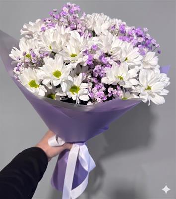 Состав: 5 веток белой ромашковидной хризантемы сорта Бакарди, 2 ветки фиолетовой гипсофилы .