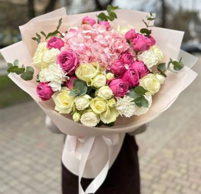 Состав: 9 белых роз сорта Аваланч, 7 белых гвоздик, 5 веток розовой кустовой розы сорта Мисти Бабблз, 5 веток белой кустовой розы, 1 розовая гортензия.