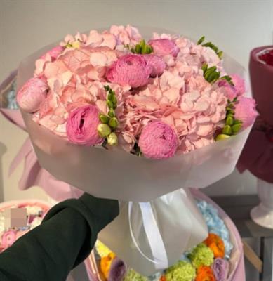 Состав: 11 нежно-розовых ранункулюсов, 4 розовые гортензии, 6 веток белой маттиолы.