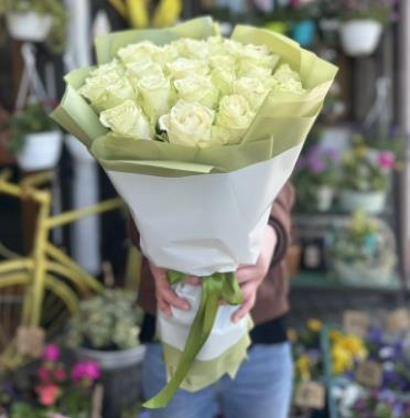 Букет «Ванільне небо» - втілення ніжності та елегантності, що складається з 25 білих троянд. Для цієї композиції ми використовуємо преміальні сорти Аваланч або Атена. Ці троянди знамениті своїми великими, бархатистими бутонами, які розкриваються в пишні хмари, і тонким, ледь вловимим ароматом.