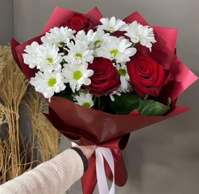 Цей букет поєднує в собі яскраві червоні троянди та ніжні білі хризантеми. Оформлений в стильну червону упаковку та білою стрічкою, він стане чудовим вибором для свята!