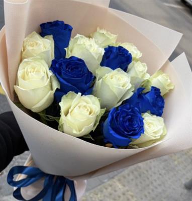 Склад: 7 синіх імпортних троянд та 8 білих імпортних троянд Mondial