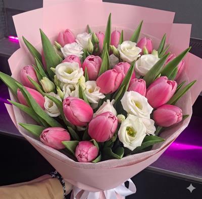 Склад: 15 рожевих тюльпанів, 4 гілки білої еустоми