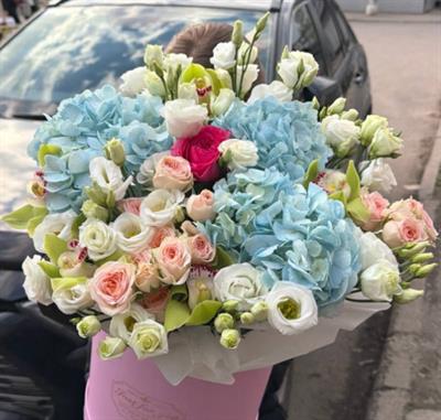 Коробка з еустоми, гортензії, орхідеї і піоновидних троянд