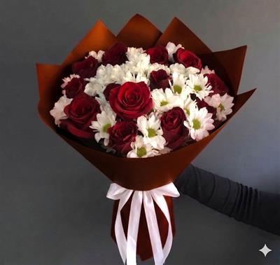 Склад: 11 червоних троянд сорту Гран Прі або Престиж, 10 гілок кущової ромашкоподібної хризантеми сорту Бакарді