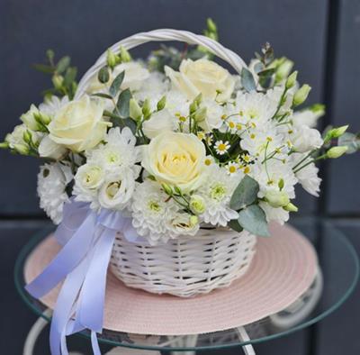 Оформлення: маленький білий кошик, оазис, евкаліпт, біла атласна стрічка, мереживна атласна стрічка.