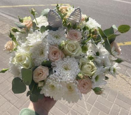Склад: 5 білих троянд, 2 гілки білої кущової хризантеми сорту Балтика, 1 гілка білої ромашкою хризантеми, 3 гілки білої еуcтоми.