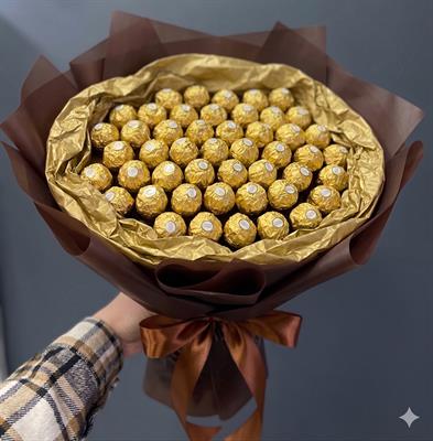 Цей букет схожий на прогулянку львівськими вуличками після дощу, коли місто пахне кавою і шоколадом. Золотаві цукерки Ferrero сяють, наче промені сонця на старовинній бруківці. Такий подарунок наповнює серце теплом і ніжністю, створює відчуття свята навіть у звичайний день. Він нагадує про красу дрібниць, про солодкість життя і про мить, яку хочеться зберегти назавжди.