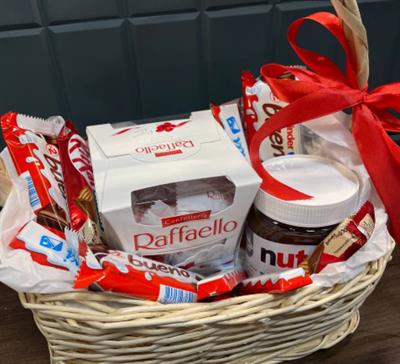 Склад: коробка Рафаелло 150 гр, 3 батончики Kitkat шоколадний 40 гр, горіхова паста Nutella 350 гр, 5 штук шоколаду Кіндер Maxi 21 гр, 3 батончики Kinder Bueno 43 гр.