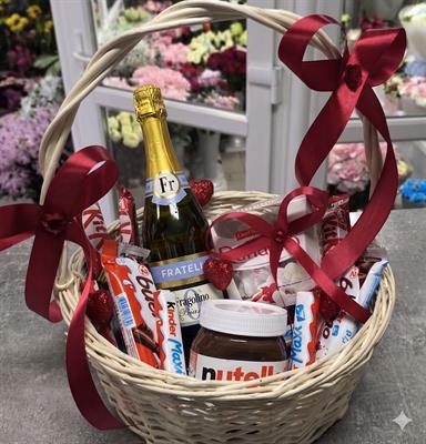 Оформлення: білий кошик, 3 червоних атласних банта, 8 декоративних сердець.